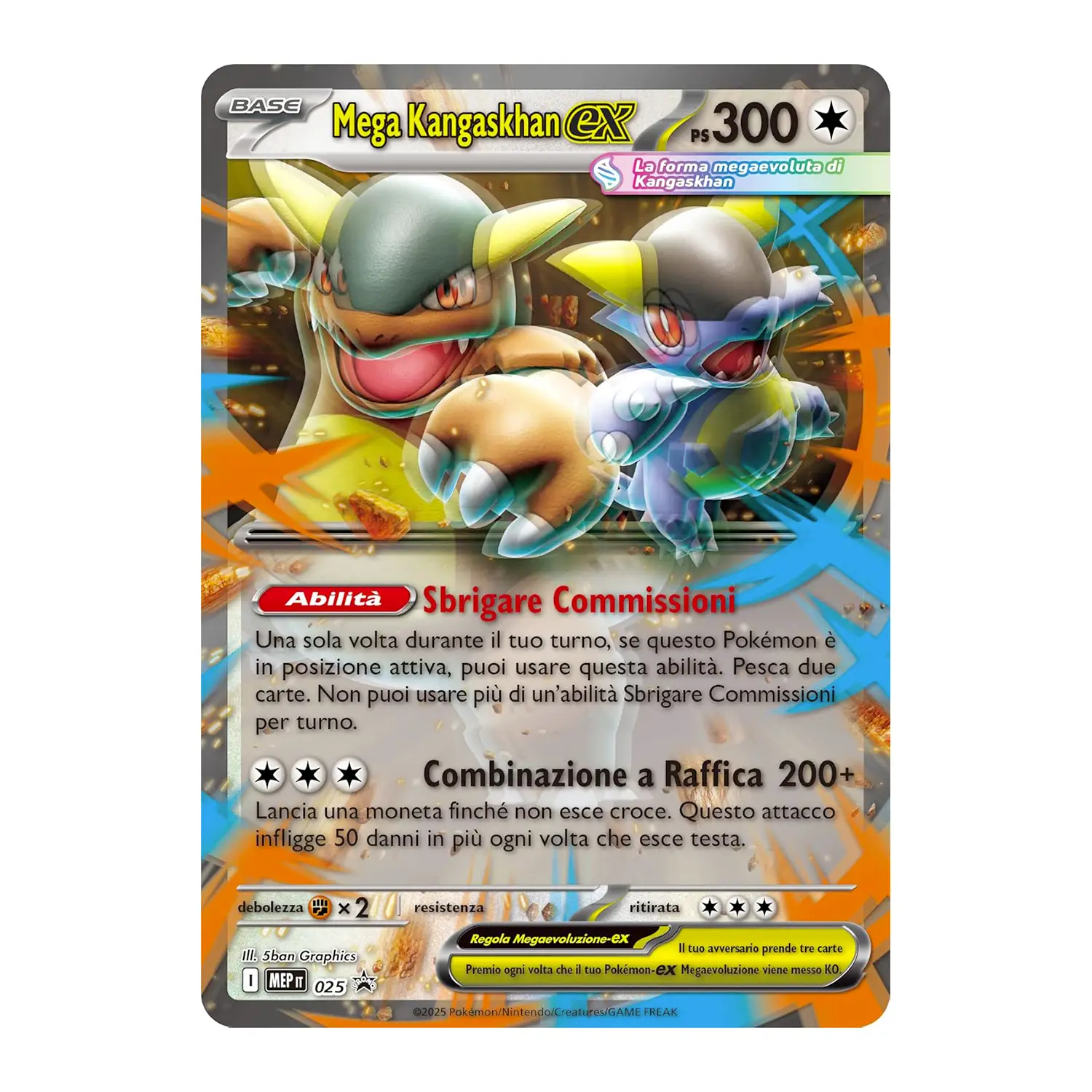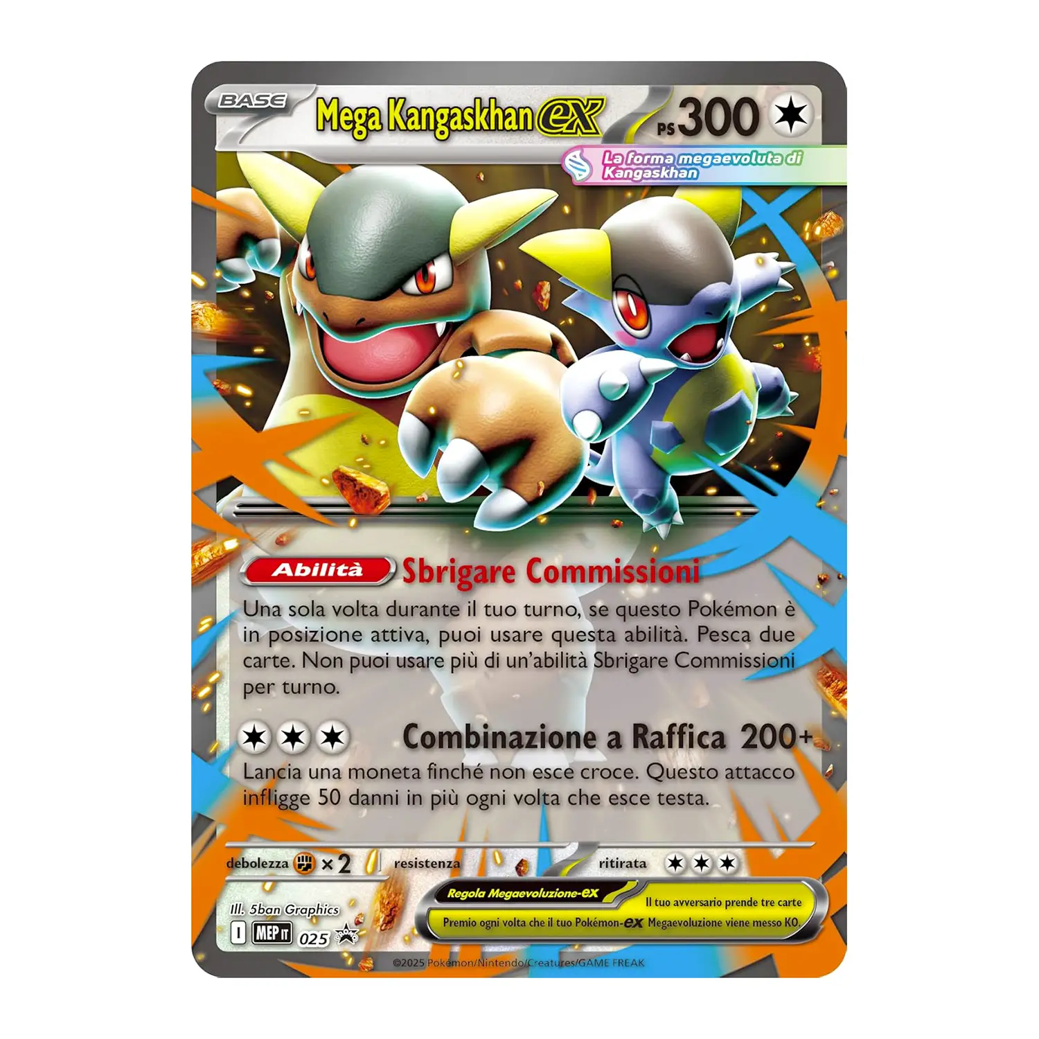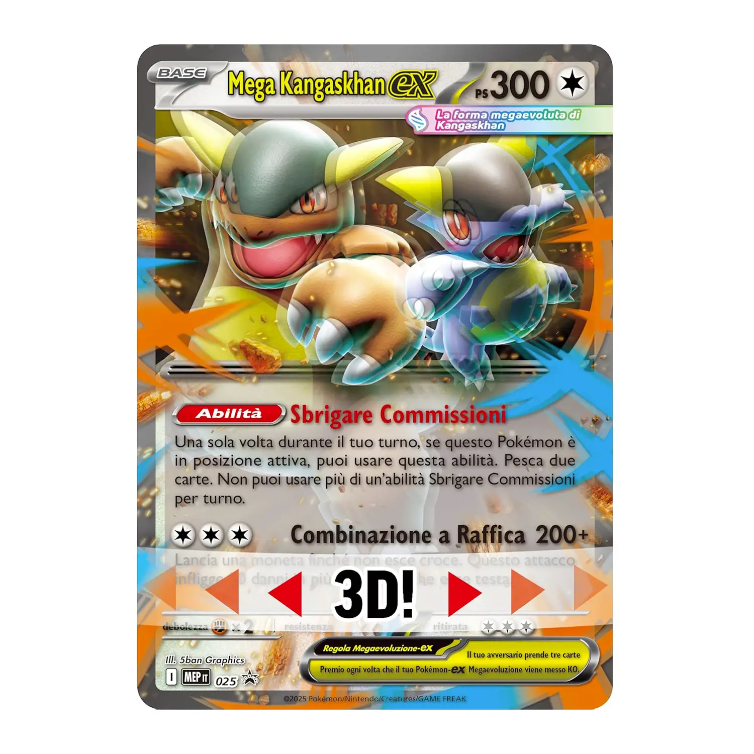 Megaevoluzione da Collezione: Con la megaevoluzione, il piccolo di Kangaskhan si trasforma in una forza della natura, pronta a dare spettacolo sul campo con un design spettacolare e dettagli olografici mozzafiato.