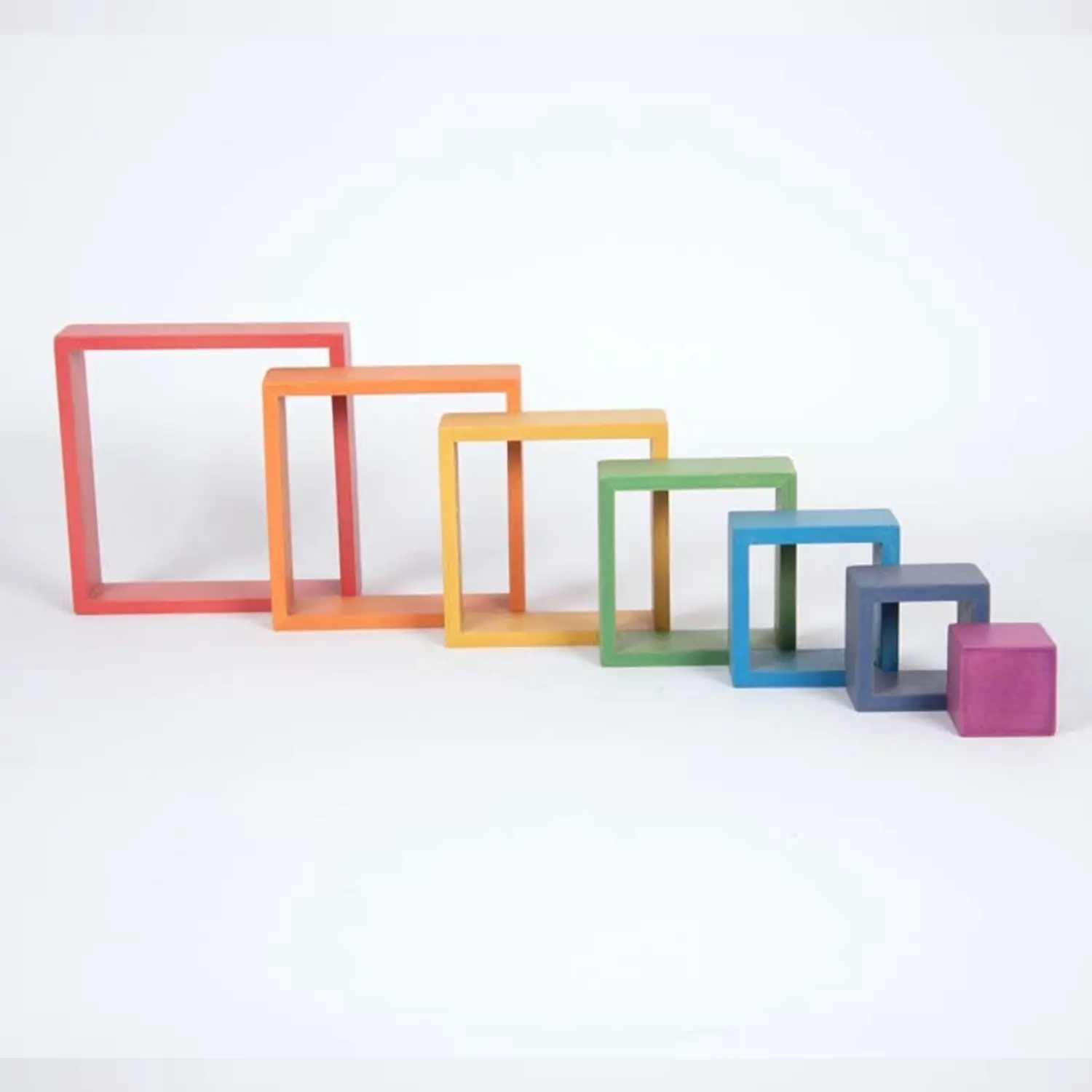 - ✅ Set of 7 solid beech wood squares, each in a vibrant rainbow color.