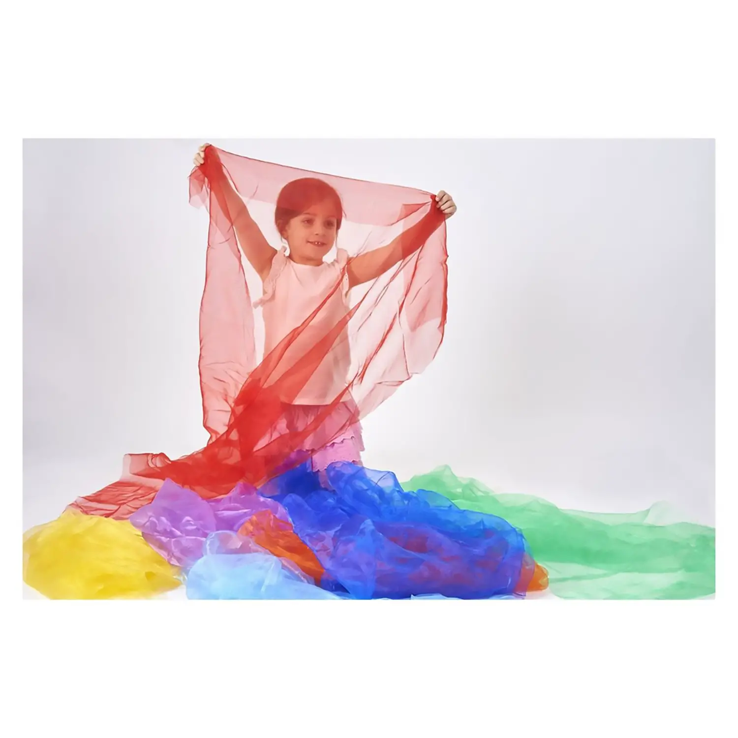 Porta colore, creatività e fantasia nelle attività dei bambini con il Set di Teli Organza Arcobaleno. Semitrasparenti e lucenti, questi teli sono ideali per giochi sensoriali, attività didattiche, scenografie e decorazioni, stimolando la fantasia, la creatività e la collaborazione tra i più piccoli.