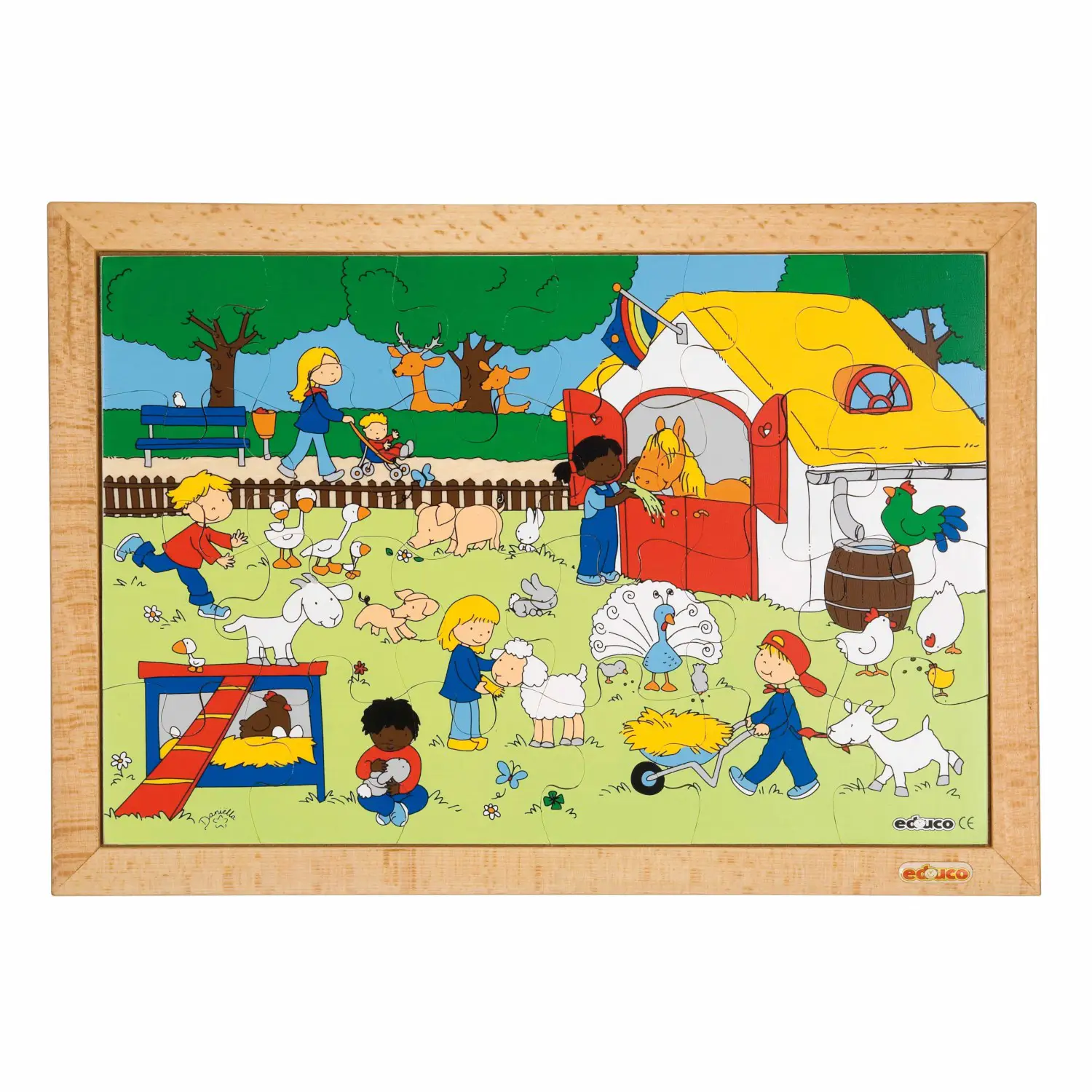 Rappresentazione della Fattoria: Il puzzle è composto da varie tessere in legno, ognuna delle quali raffigura una situazione o un’attività tipica che i bambini possono svolgere nella fattoria, come nutrire gli animali, raccogliere le uova, passeggiare tra gli animali, ecc.
