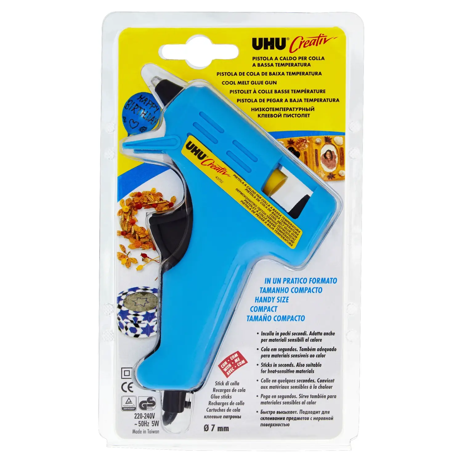 Pistola manuale a bassa temperatura per colla a caldo, affidabile e sicura, ideale per hobby, bricolage e riparazioni. Grazie alla ridotta temperatura di esercizio, raggiunta in soli 5 minuti, è possibile incollare polistirolo espanso e altri materiali sensibili al calore.