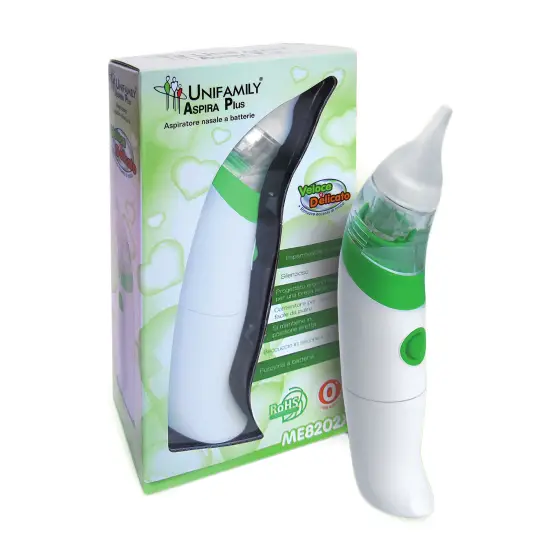The battery-powered nasal aspirator, represents the ideal product for removing excess mucus from your child's nostrils. Ergonomically designed, with aseptic and hygienic material, it is a convenient device to carry even when traveling, as it is battery-powered. The aspirator is decomposable into easily washable parts, and has two silicone nozzles of different sizes. Thanks to its excellent design, the practical and handy Aspira Plus also stands upright. Complies with EC Directive MDD 93/42/EEC