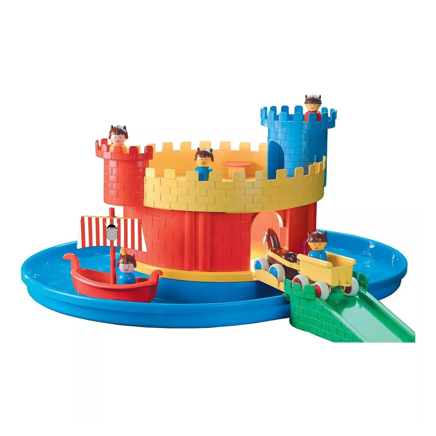 Castello in robusto materiale plastico infrangibile e flessibile completo di torrioni, ponte levatoio e fossato riempibile d’acqua e percorribile con barchette.