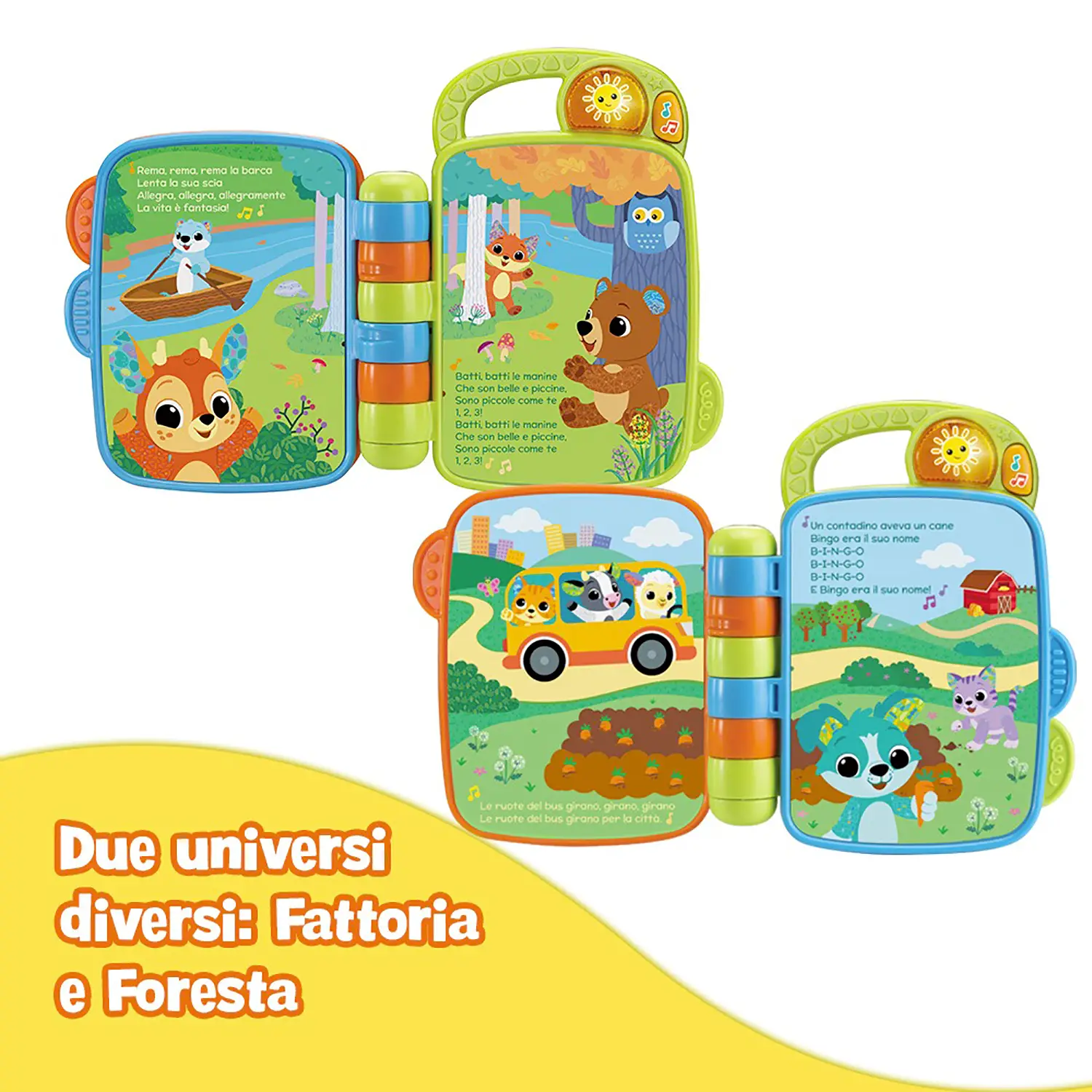 Funzioni Musicali Educative Le quattro pagine illustrate includono un tasto Scoperta per imparare i nomi degli animali e un tasto Musica con 15 melodie allegre, perfette per stimolare movimento, ritmo e divertimento.