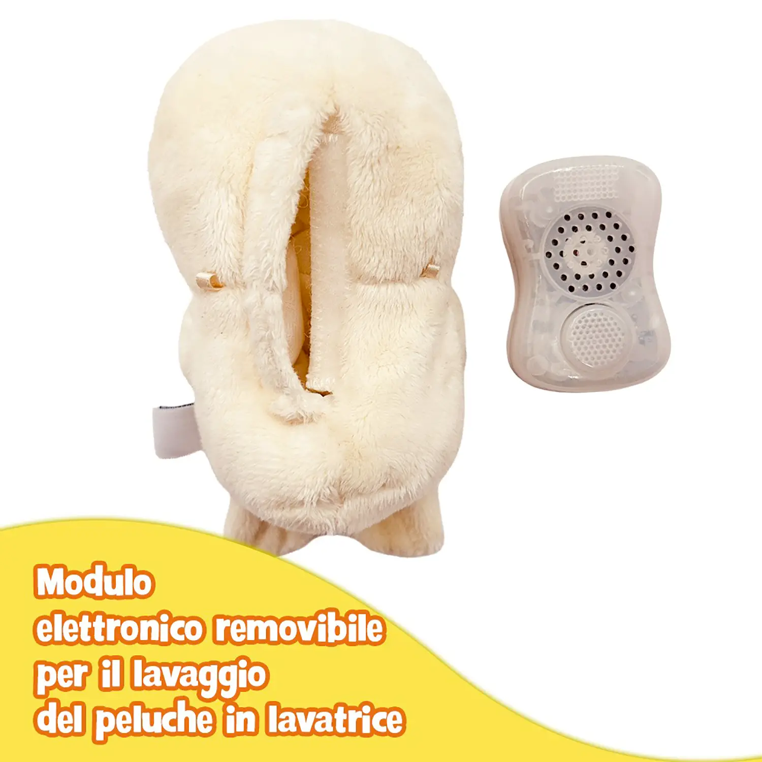 Lavabile e Sicuro Il modulo elettronico removibile permette il lavaggio in lavatrice del peluche. Dotato di spegnimento automatico e regolazione del volume, funziona con 2 batterie AAA (non incluse), garantendo praticità e sicurezza per l’uso quotidiano.